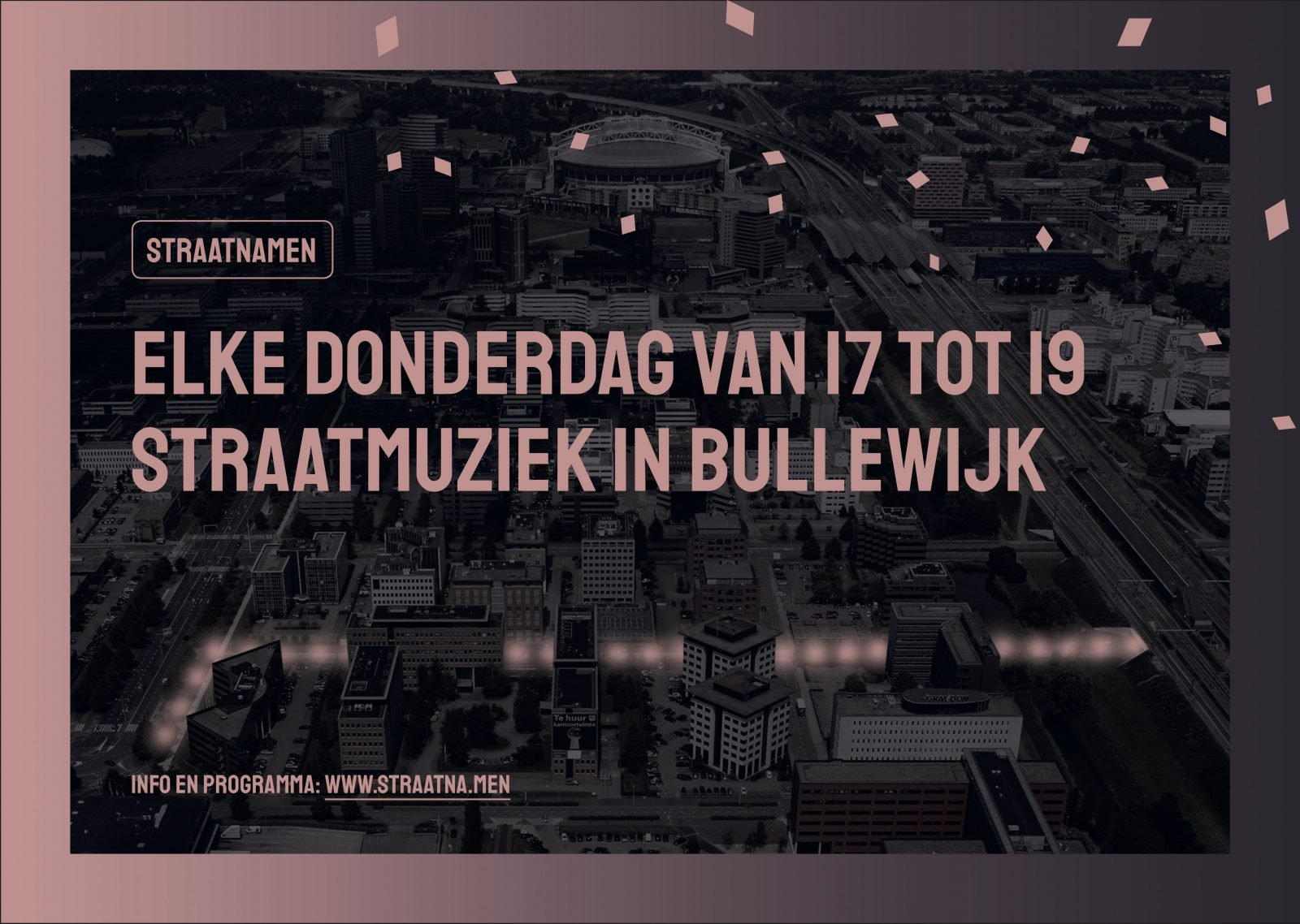 Straatnamen brengt t/m eind maart tien weken lang iedere donderdag tussen 17:00 en 19:00 uur straatmuziek en licht naar het Bullewijkpad. Het achterliggende doel is het verbeteren van het gevoel van veiligheid na kantoortijd. Harp, japanse gong, dwarsfluit… je gaat het allemaal horen! Kijk op de website voor meer info.